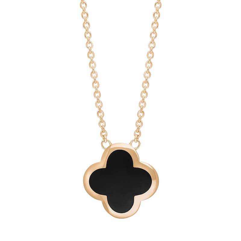 This elegant pendant features a stunning four leaf clover shaped cabochon of the finest Whitby Jet stone, sourced directly from the north east coast of Yorkshire. The clover is surrounded with a polished edge detail for a unique, stylish finish. The striking Whitby Jet forms a stunning contrast between the 9ct rose gold polished frame, creating the perfect look for every occasion. Presented on an 18 inch long 9ct rose gold chain.