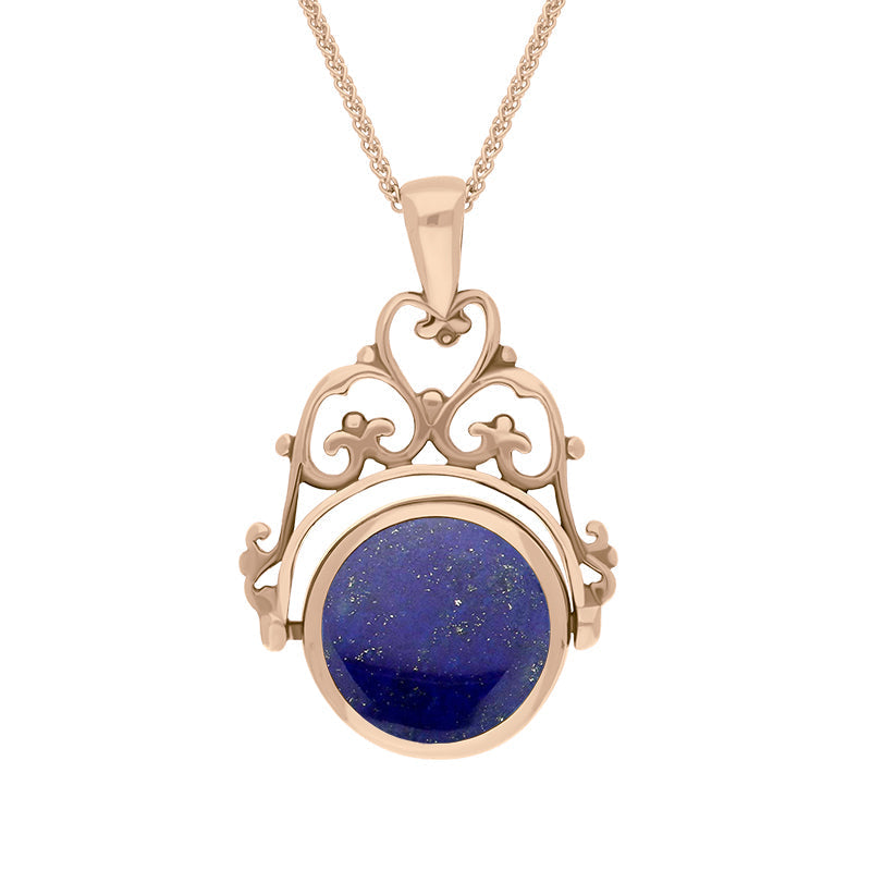 9ct Rose Gold Whitby Jet Lapis Lazuli Double Sided Round Swivel Fob Necklace, P110_2.