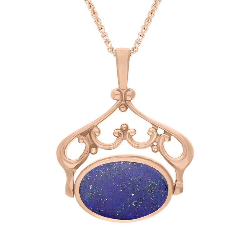9ct Rose Gold Whitby Jet Lapis Lazuli Ornate Double Sided Oval Swivel Fob Necklace, P116_8.