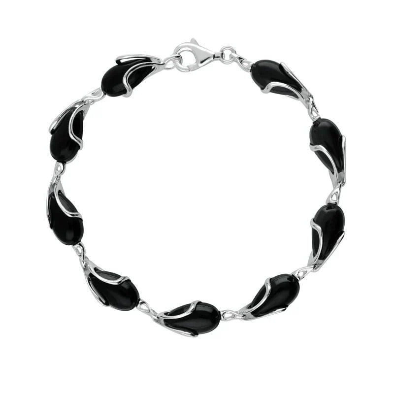 This elegant sterling silver bracelet features 9 pear shaped Whitby Jet gemstones that have been hand cut and polished by our expert jewellers, and set into a contemporary sterling silver wave edge design. A perfect bracelet for any occasion with a very fresh and modern feel.