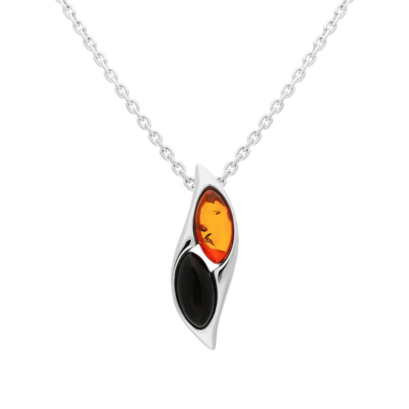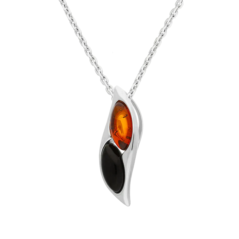 This versatile necklace features genuine Amber and Whitby Jet framed in Sterling Silver. This feminine necklace is perfect for day to evening wear and is presented on an 18'' long Sterling Silver chain with a classic lobster clasp for easy wear.