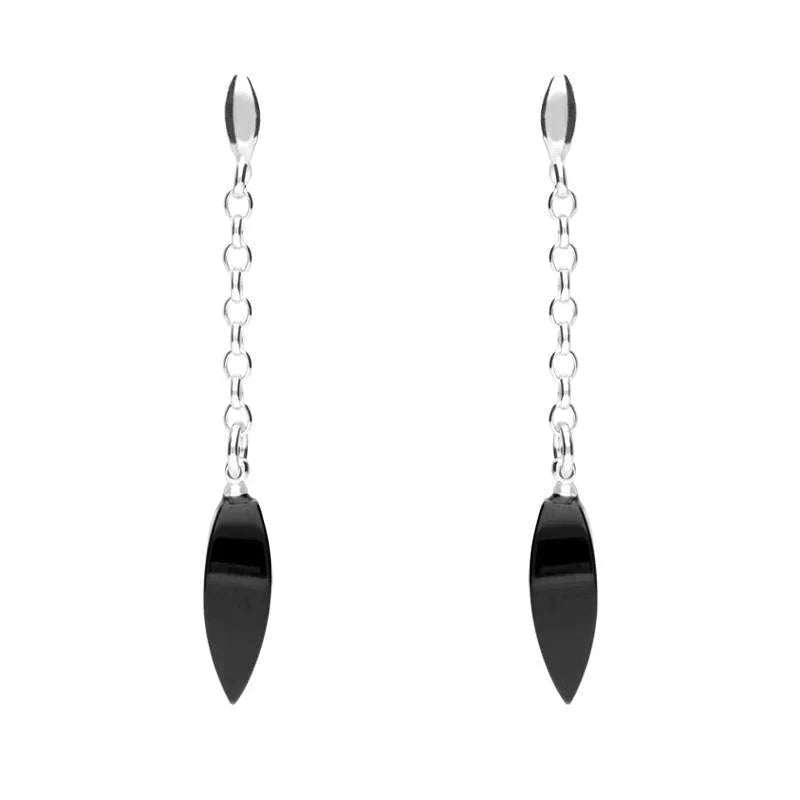 These elegant earrings feature the finest Whitby Jet stone, sourced directly from the north east coast of Yorkshire. The stones hang gracefully from sterling silver chains for a beautiful finish. The striking drop earrings are perfect for everyday wear and are easily secured with butterfly and post fastenings.