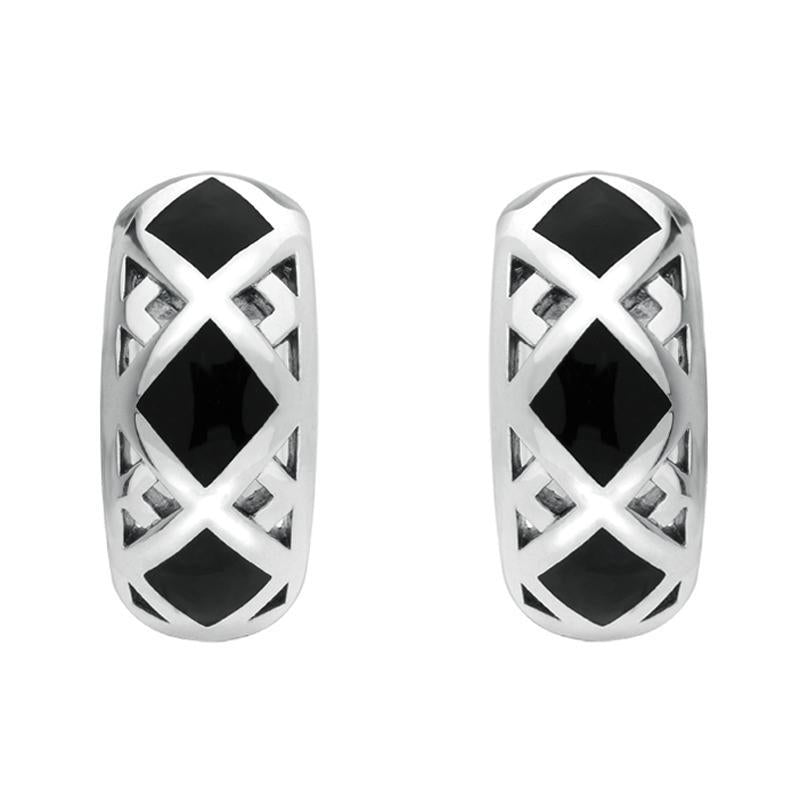 This beautiful three piece set has been created using a brilliant combination of solid sterling silver and the highest quality hand carved Whitby Jet. The geometric style of the pieces creates a brilliant contrast between the endless black of Whitby Jet and the bright shine of the silver. The layers of silver also add depth, and create an overall interesting and contemporary design. Comprising of a pair of hoop earrings, bracelet and necklace, complete with an 18 inch sterling silver chain. All items can be sold separately.