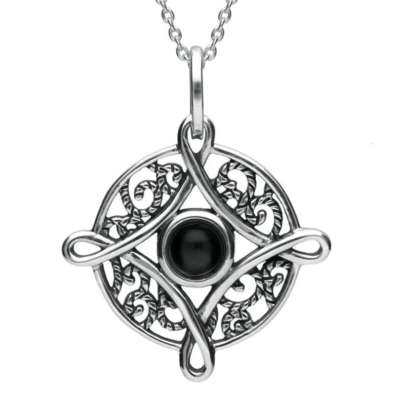 This elegant necklace showcases a stunning circular shaped cabochon of the finest Whitby Jet stone. The Jet is framed by a Celtic style four point sterling silver cross, complimented by a delicate filigree rope design. The pendant sits gracefully on a fine sterling silver chain which is completed by a classic bolt ring clasp for easy wear.