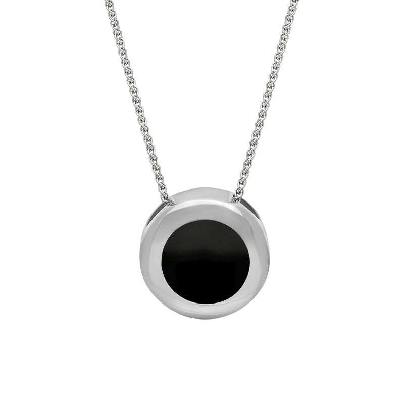This elegant necklace features a stunning circular shaped cabochon of the finest Whitby Jet stone, sourced directly from the North East coast of Yorkshire. The beautiful sterling silver pendant hangs gracefully from a fluid 18 inch long sterling silver chain complete with a classic bolt ring clasp for easy wear.