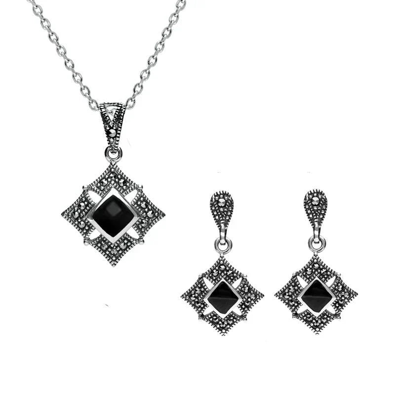 Sterling Silver Whitby Jet Marcasite Square Two Piece Set, S084.