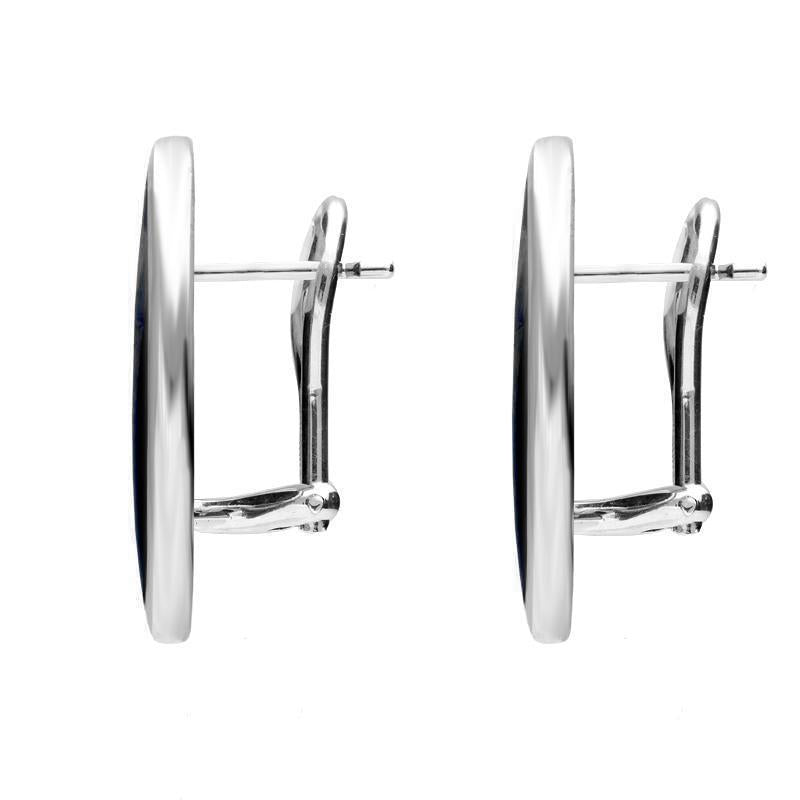 These classic earrings feature two oval shaped cabochons of the finest Whitby Jet stone, sourced directly from the North East coast of Yorkshire. The sterling silver frames are perfect for everyday wear and are secured with post and butterfly fastenings.