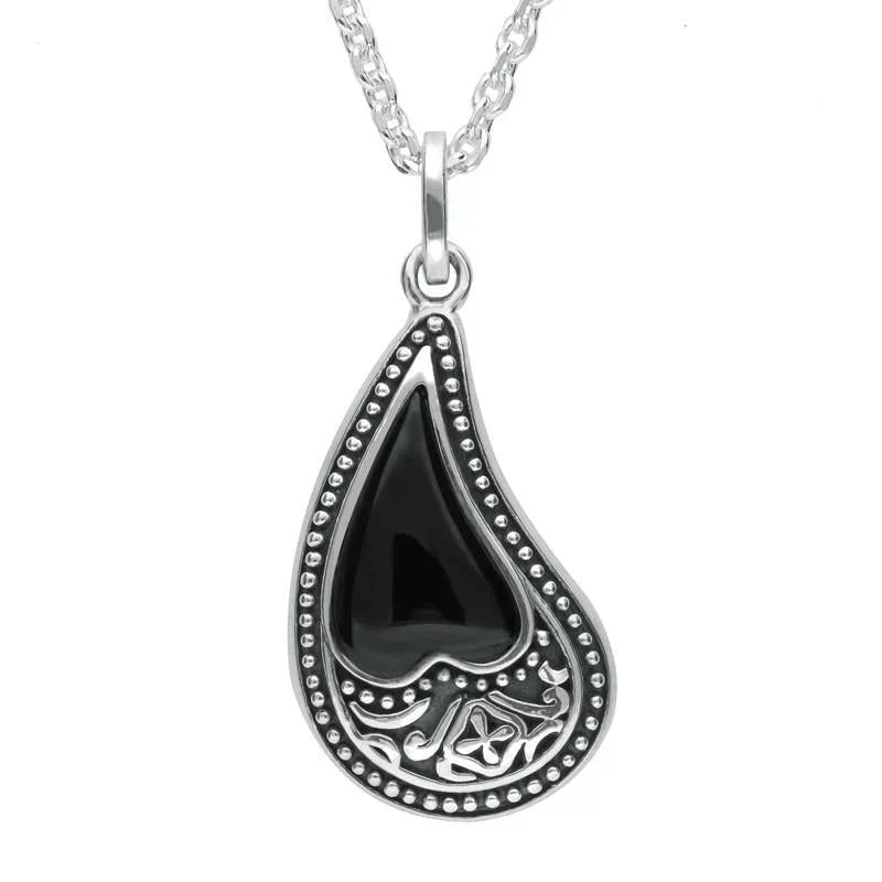 This romantic necklace features a stunning heart shaped cabochon of the finest Whitby Jet stone, sourced directly from the North East coast of Yorkshire. The Whitby Jet stone is placed in a beaded sterling silver tear drop frame, which features a beautiful pattern. The elegant pendant hangs gracefully from a fluid 18 inch long sterling silver chain complete with a classic bolt ring clasp for easy wear.
