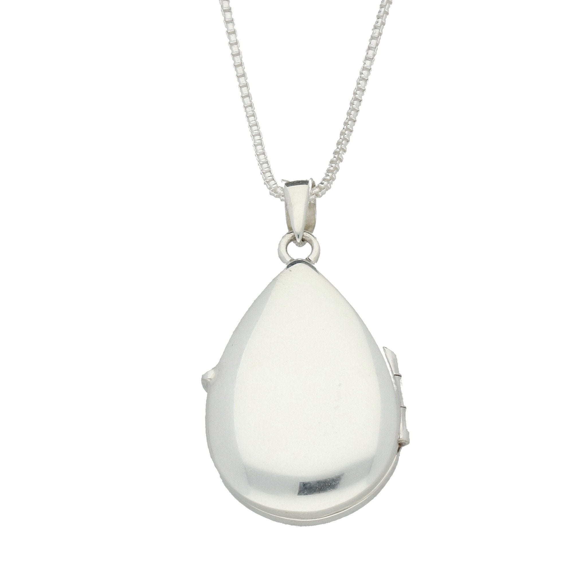 This solid sterling silver locket features an elegant pear drop shaped cabochon of fine Whitby Jet stone, sourced directly from the North East coast of Yorkshire. The gemstone is framed by twisted rope and engraved swirl detailing. Sold complete with an 18 inch sterling silver chain which fastens with a classic bolt ring style clasp.