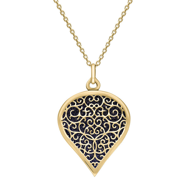 9ct Yellow Gold Blue Goldstone Flore Filigree Large Heart Necklace. P3631.