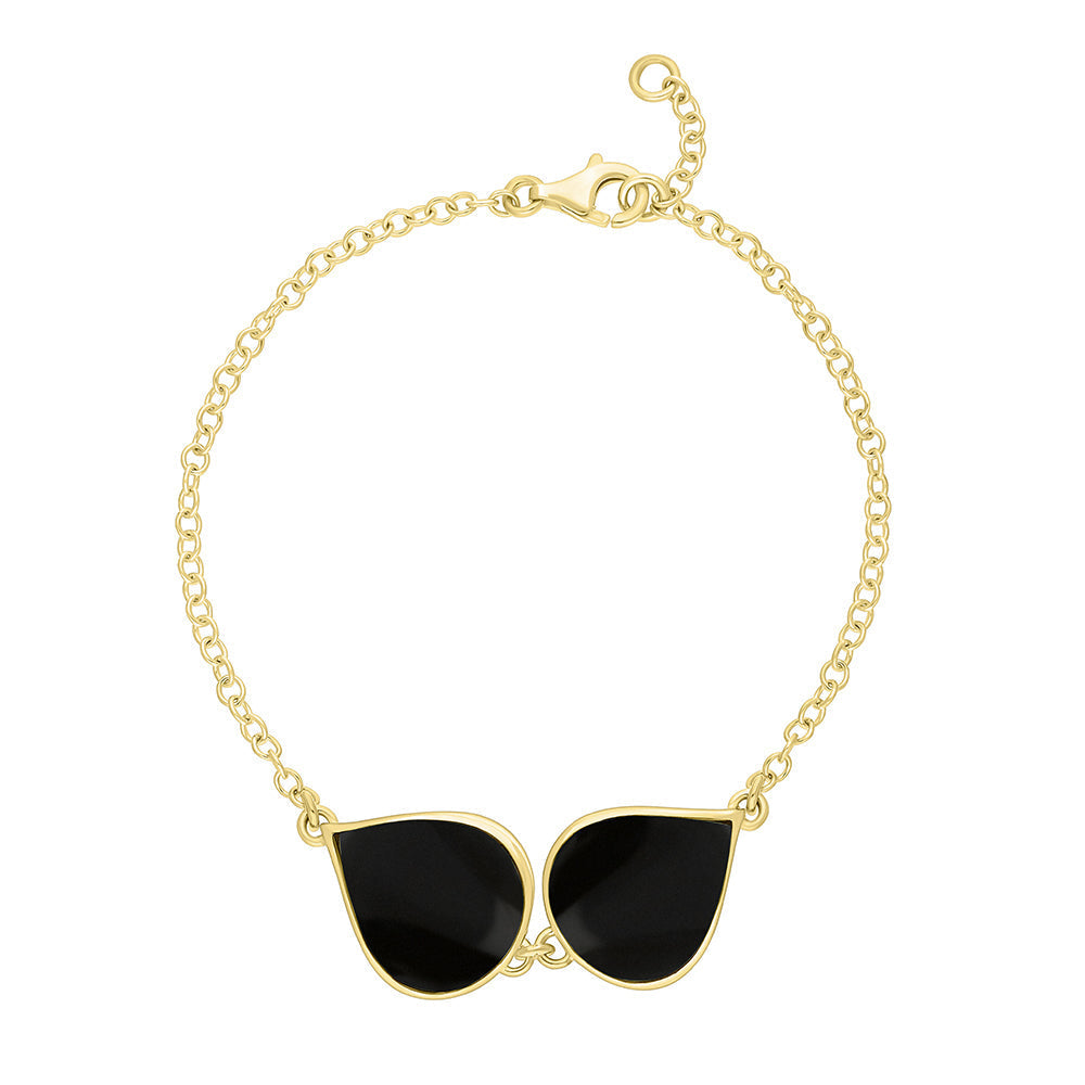 This bracelet is part of Rebecca Sellors' Flore collection, featuring two beautifully crafted teardrop-shaped cabochons of the finest Whitby Jet stone which has been sourced locally from the Whitby coastline, North Yorkshire. Encased within an intricate 9ct yellow gold filigree design, this piece is complete with a classic chain which fastens with a lobster clasp, ensuring a secure and comfortable fit.