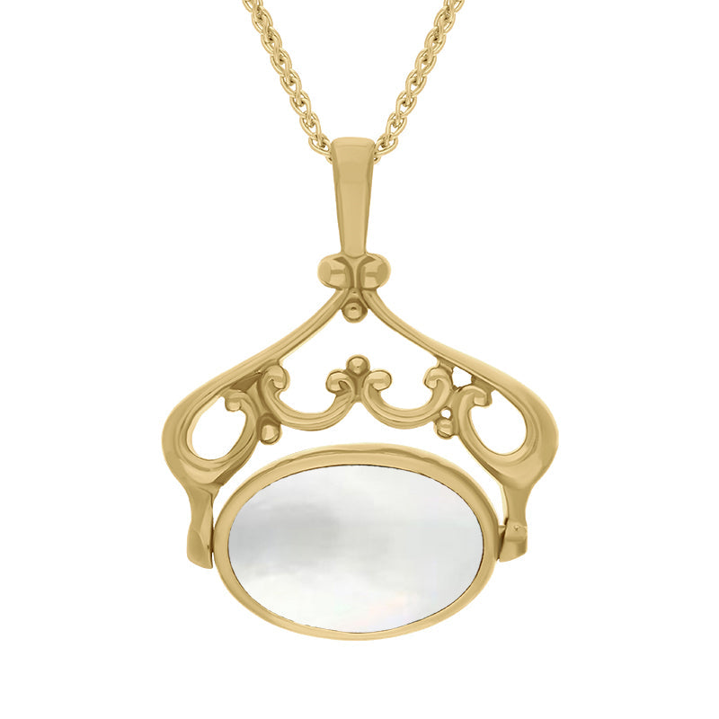 9ct Yellow Gold Whitby Jet Mother Of Pearl Ornate Double Sided Oval Swivel Fob Necklace, P116_8.