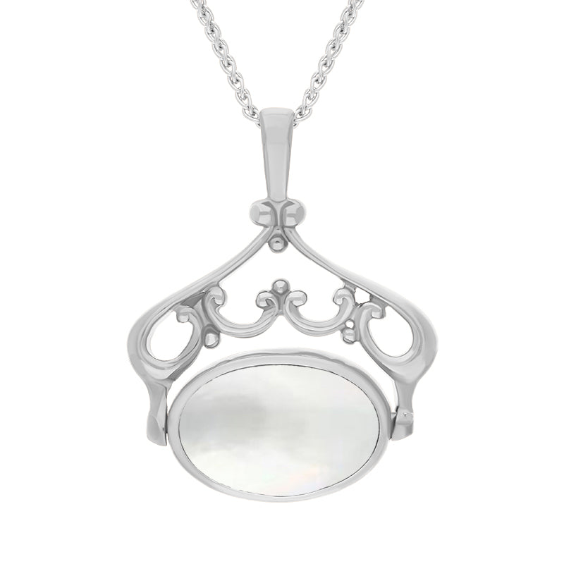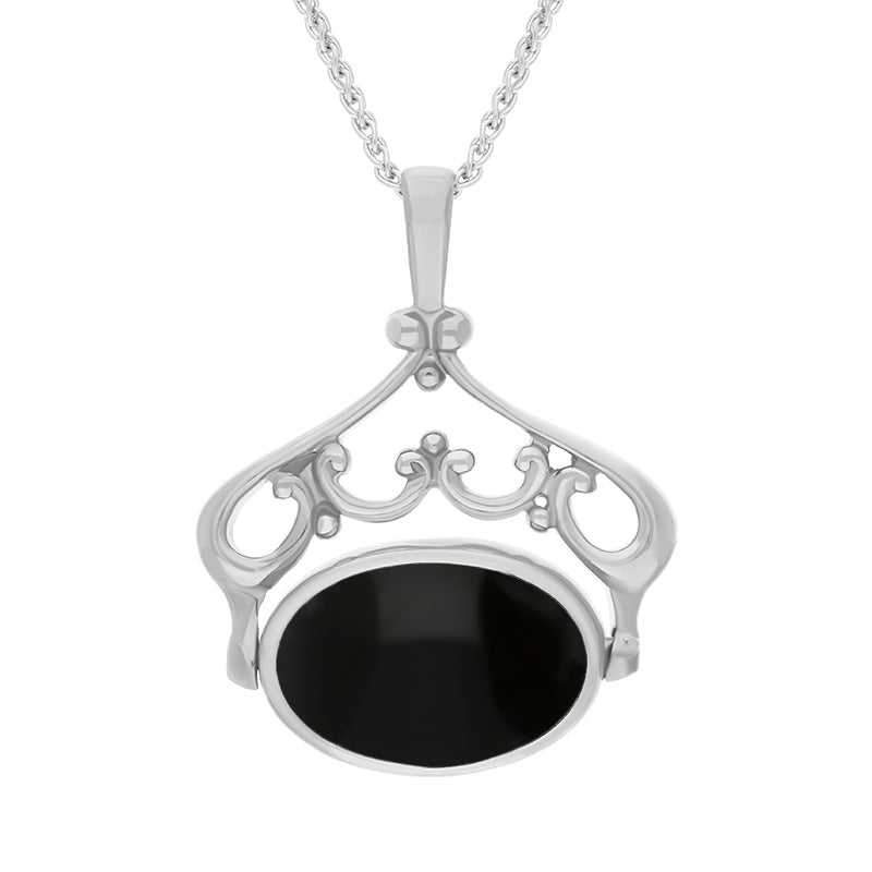 This classic fob swivel necklace is part of the Whitby Jet Store Heritage handmade collection and features a double sided pendant set with oval cut locally sourced Whitby Jet and White Mother Of Pearl. The stones are set in an ornate hinged sterling silver pendant, which moves with the wearer and features a unique design, hanging gracefully from an 18 inch sterling silver chain.