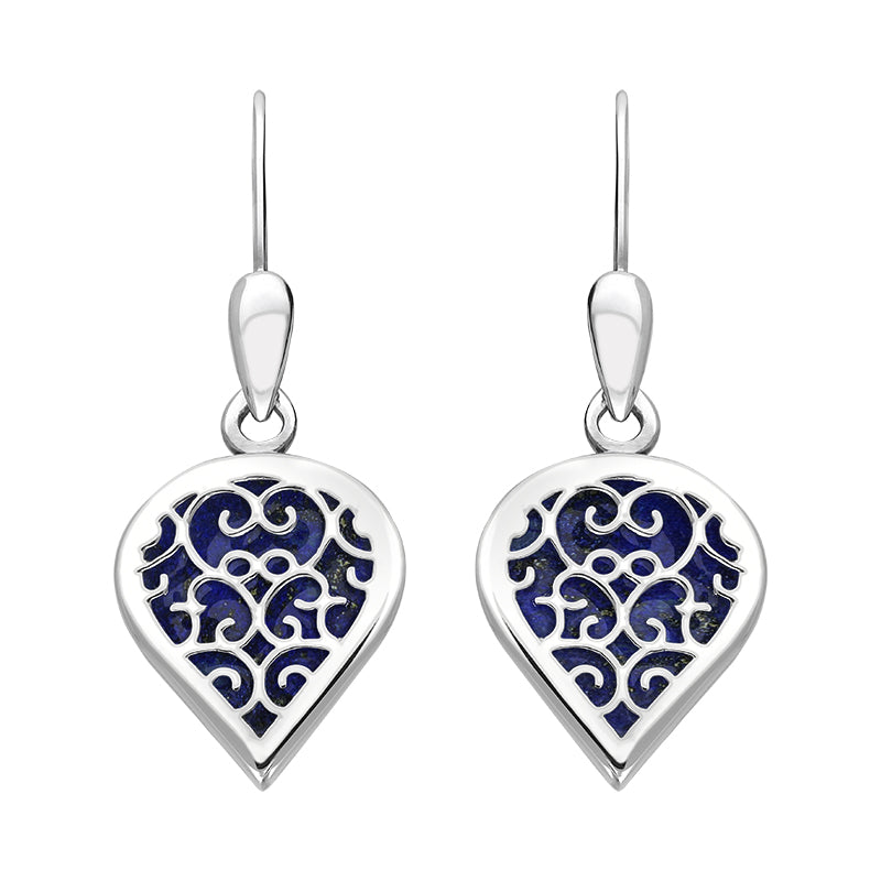 18ct White Gold Lapis Lazuli Flore Filigree Heart Drop Earrings. E2588.