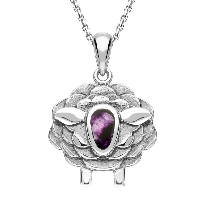 This simple pendant features a beautiful sheep design, where a stunning piece of Blue John completes the sheep face. Sold complete with an 18 inch 9ct white gold chain which fastens with a classic bolt ring style clasp.