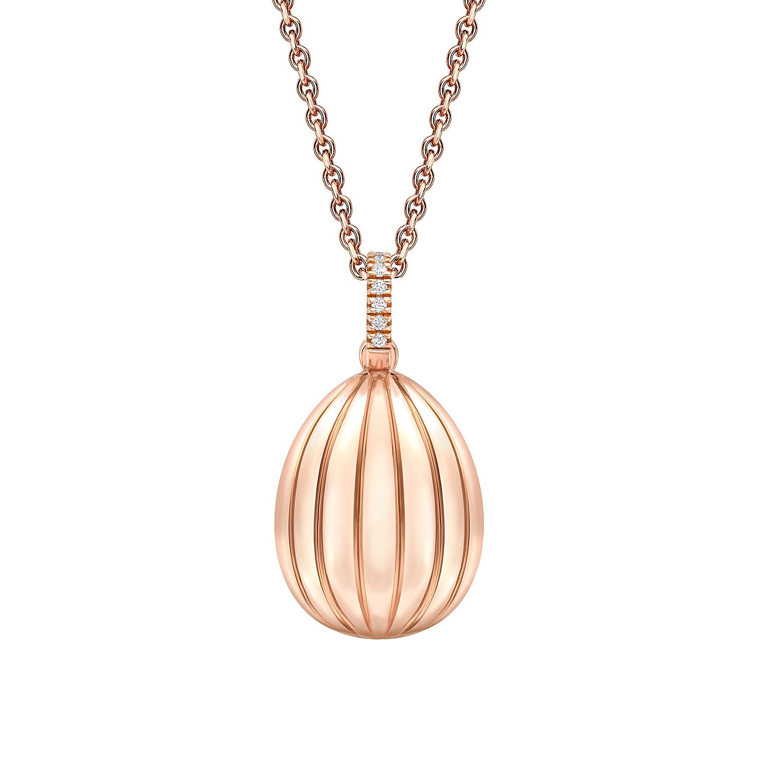 The Faberge 180th Anniversary Limited Edition Fluted Egg Pendant features 18ct rose gold, 13 round brilliant cut white diamonds (0.04ct total F.G, VS+) and 1 round Gemfields Mozambique Ruby (0.04ct). It is presented on a 1.3mm trace chain which measures 45-50cm in length.