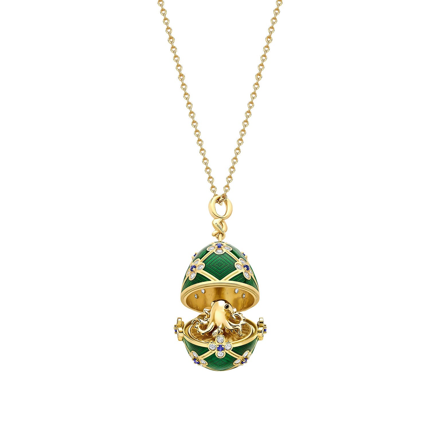 In true Fabergé style, the beautiful egg locket also offers a surprise – opening to reveal a miniature 18k gold octopus inside, capturing the spirit of the film’s namesake. The octopus has been set with two black diamond eyes.