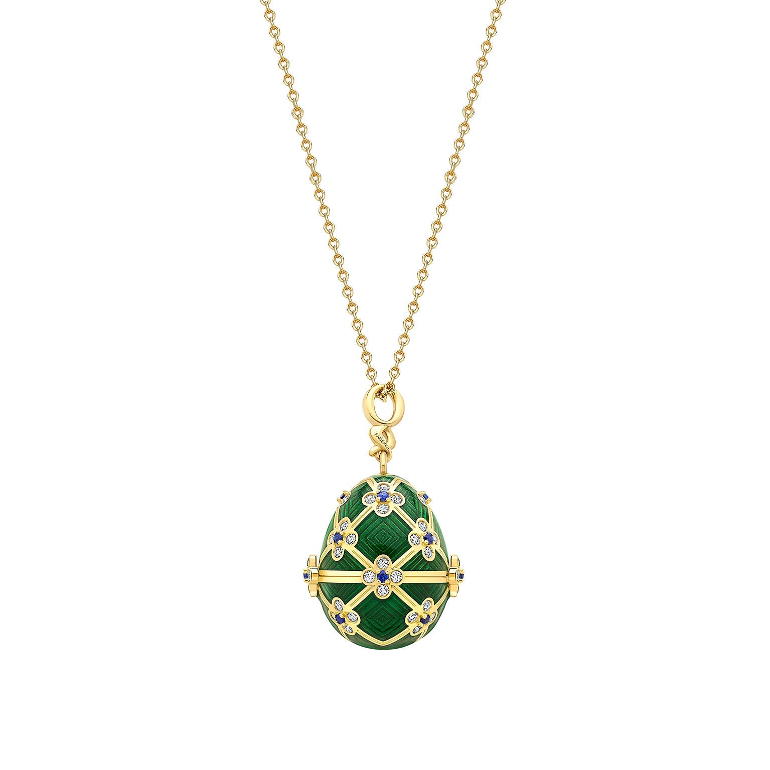The Fabergé x 007 Special Edition Octopussy Egg Surprise Locket has been crafted from 18k yellow gold, and is decorated with green guilloché enamel and set with 60 white diamonds and 15 blue sapphires. The exterior of the egg closely follows the design of the Fabergé egg featured in the film Octopussy, with a beautiful 18k gold lattice framework which is delicately set with blue sapphires and white diamonds in a floral-like design.