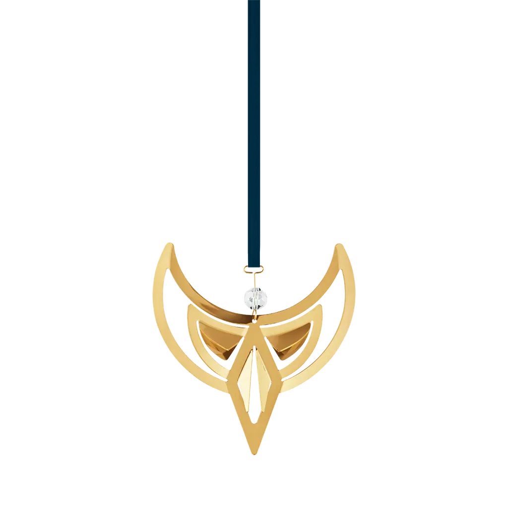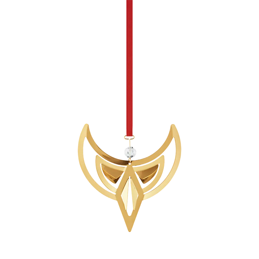 This 18kt gold-plated angel ornament, a part of the 2024 Christmas Collectibles, is the design of long-time Georg Jensen collaborator Sanne Lund Traberg. Its elegant form, flanked by sweeping golden wings, is topped with a shimmering zirconia ball and hangs from a festive red ribbon.