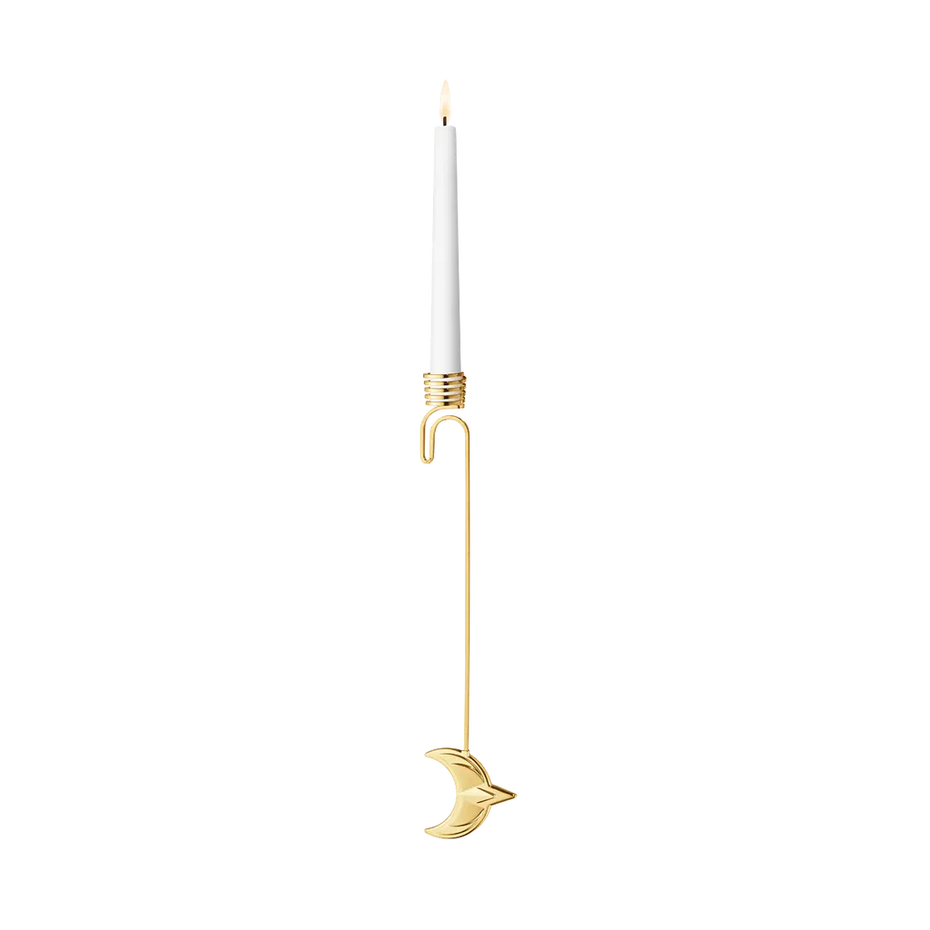 This festive candleholder, a part of the 2024 Christmas Collectibles series, is the design of long-time Georg Jensen collaborator Sanne Lund Traberg. Created to perch upon the branch of a Christmas tree, the base of the candle sits within a snug, gold-plated ring that is balanced by a crescent moon-shaped ornament that hangs beneath.