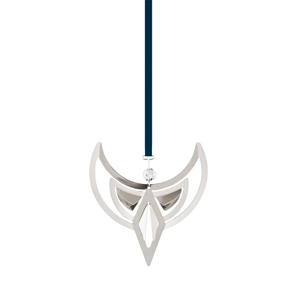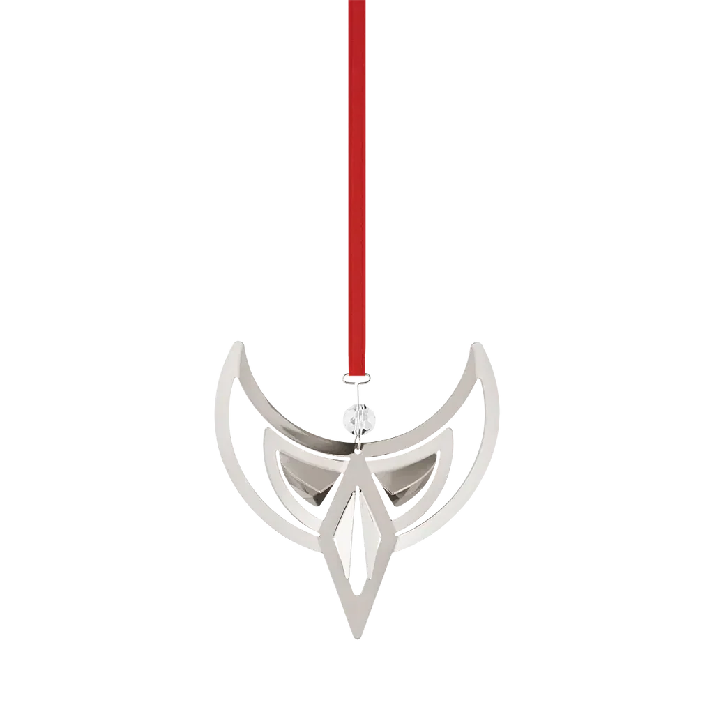 This elegant palladium-plated angel ornament, a part of the 2024 Christmas Collectibles, is the design of long-time Georg Jensen collaborator Sanne Lund Traberg. Its elegant form, flanked by sweeping golden wings, is topped with a shimmering zirconia ball and hangs from a festive red ribbon.