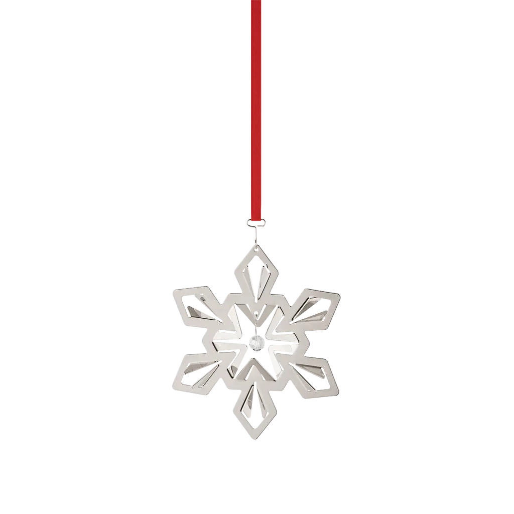 This shimmering snowflake ornament, a part of the 2024 Christmas Collectibles, is the design of long-time Georg Jensen collaborator Sanne Lund Traberg, who was inspired by the soft flurry of a snowy winter sky. The delicate, palladium-plated ornament hangs from a festive red ribbon and features a small zirconia ball at its centre for an extra touch of sparkle.